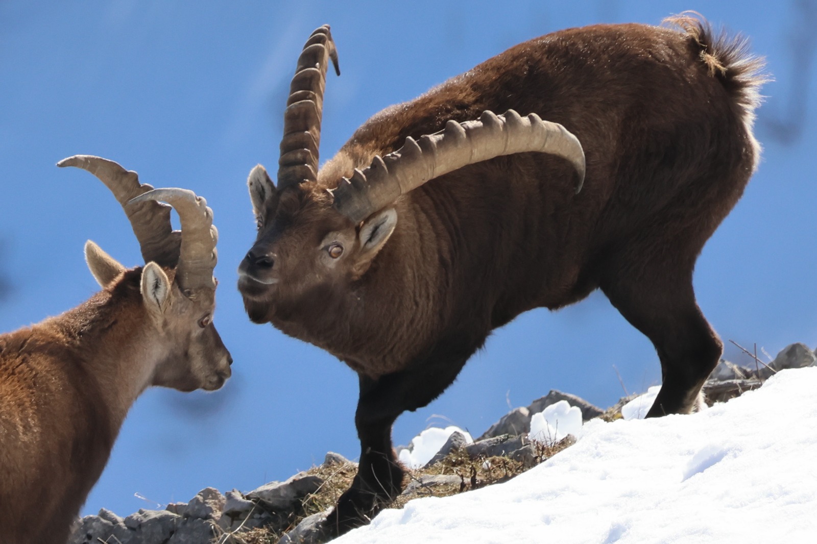 ⚔️ Une simple sortie en ski de randonnées dans le Vercors peut alors offrir des scènes rares de la cour faite par le bouquetin des Alpes (𝑐𝑎𝑝𝑟𝑎 𝑖𝑏𝑒𝑥). Fabien Quétier et Nicolas Marty ont eu le bonheur d’observer en direct de la Tête des Chaudières des mâles croiser le fer de leurs cornes. Jusqu’à la mi-Janvier, tous les mâles s’affrontent et tentent de prendre la tête de la harde pour pouvoir accéder à la reproduction.